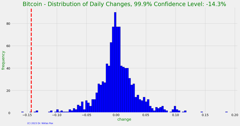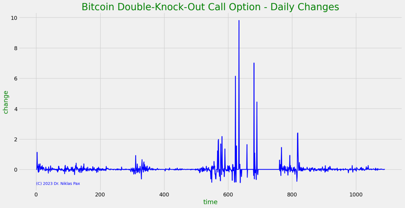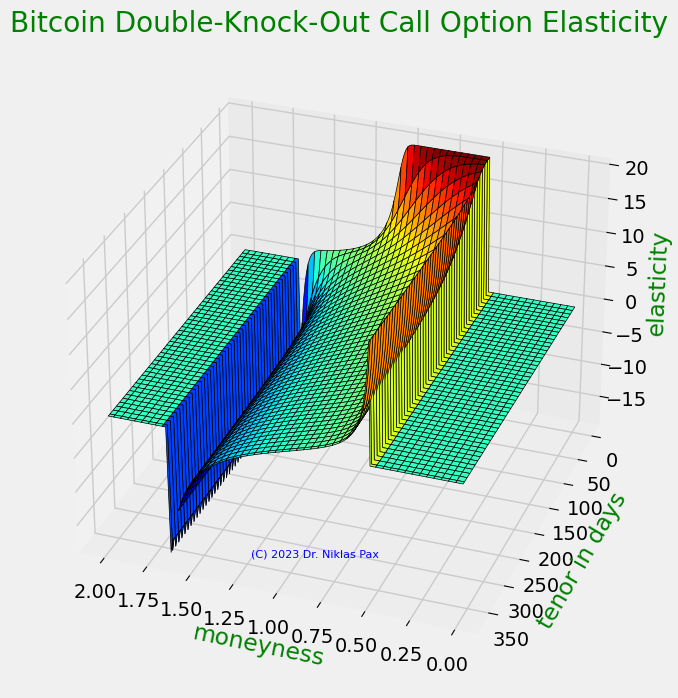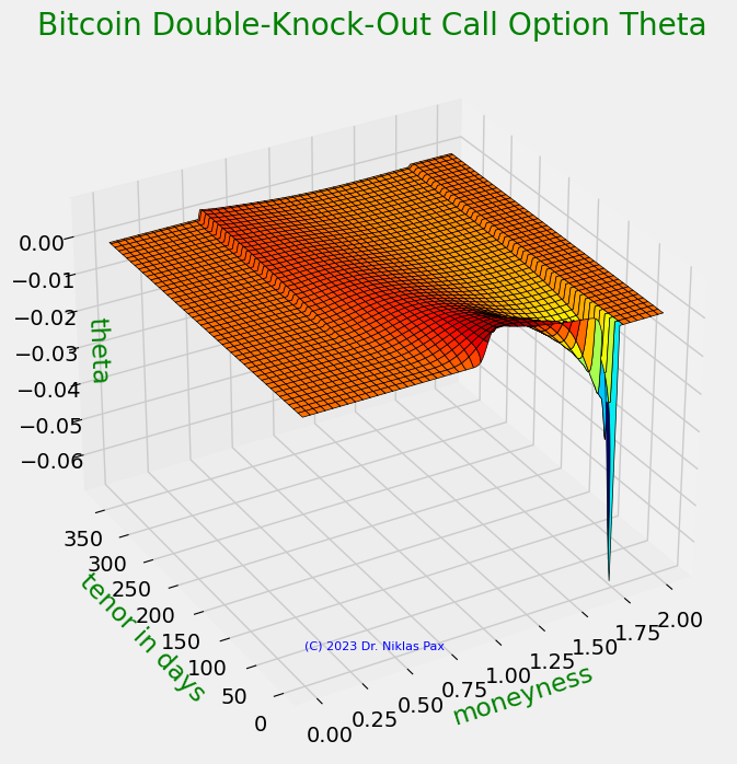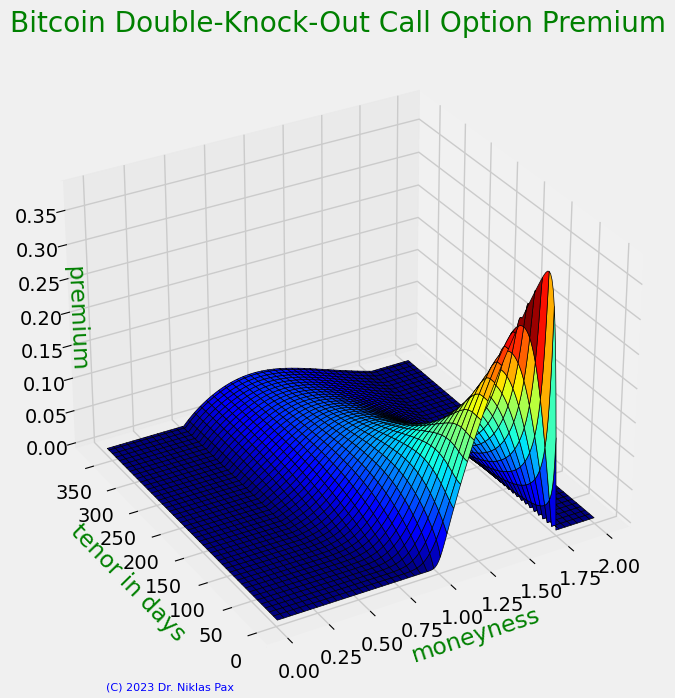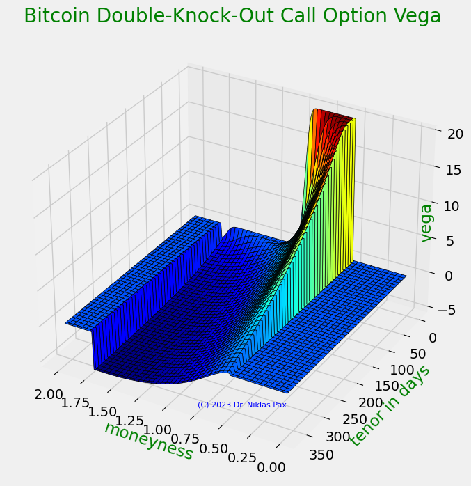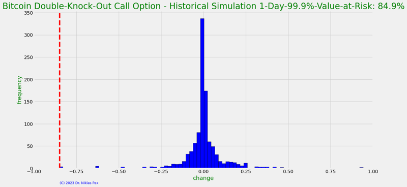 A european style double-knock-out option on Bitcoin with american style barriers is priced and sensivities (greeks) are derived numerically. The 99.9% value-at-risk ist calculated based on a historical simulation. The option's strike is at 40,000 and the barriers are at 20,000 and 70,000, the tenor is one year.