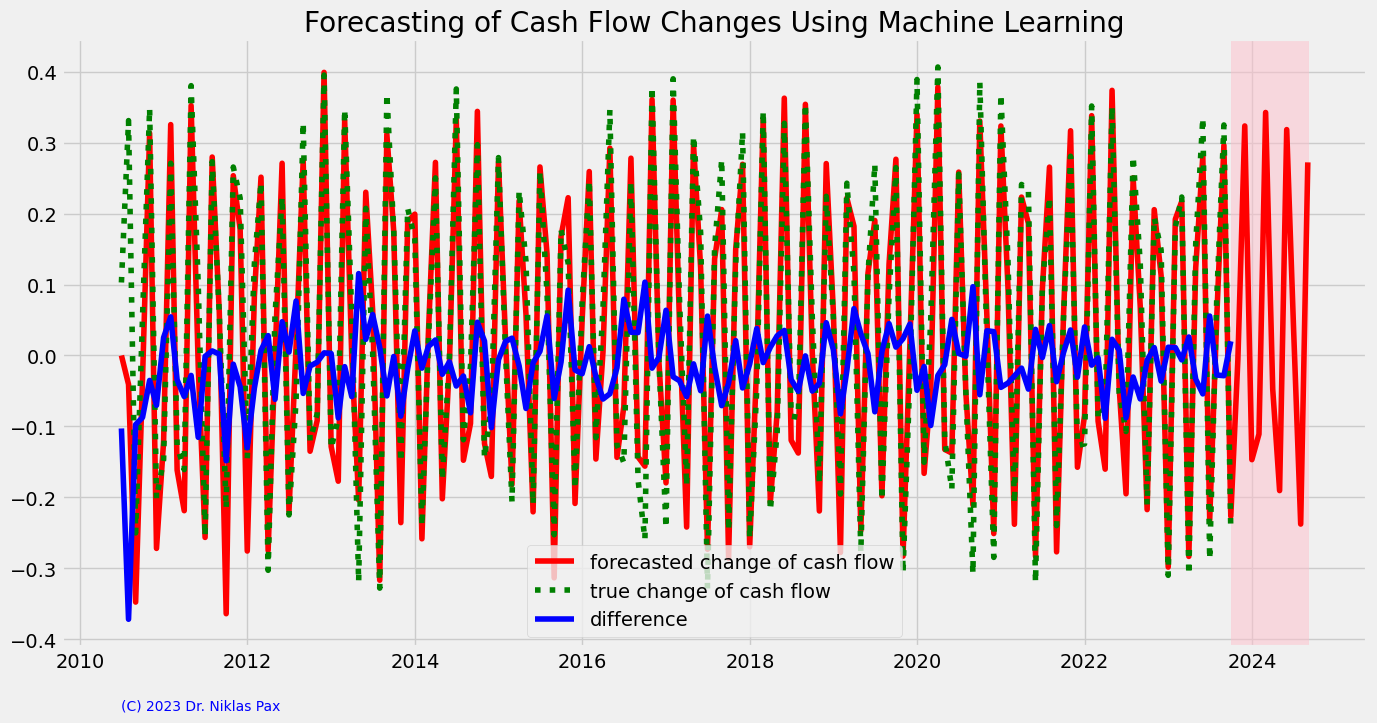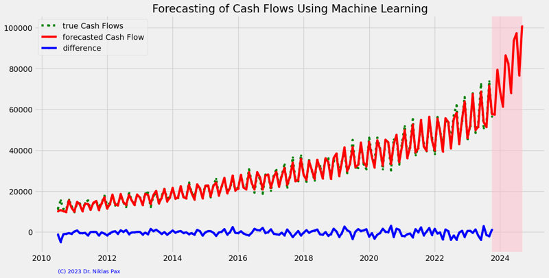 Forecasting of future cash flows using machine learning on an artificial stream of cash flows with trend, seasonalities and random noise.